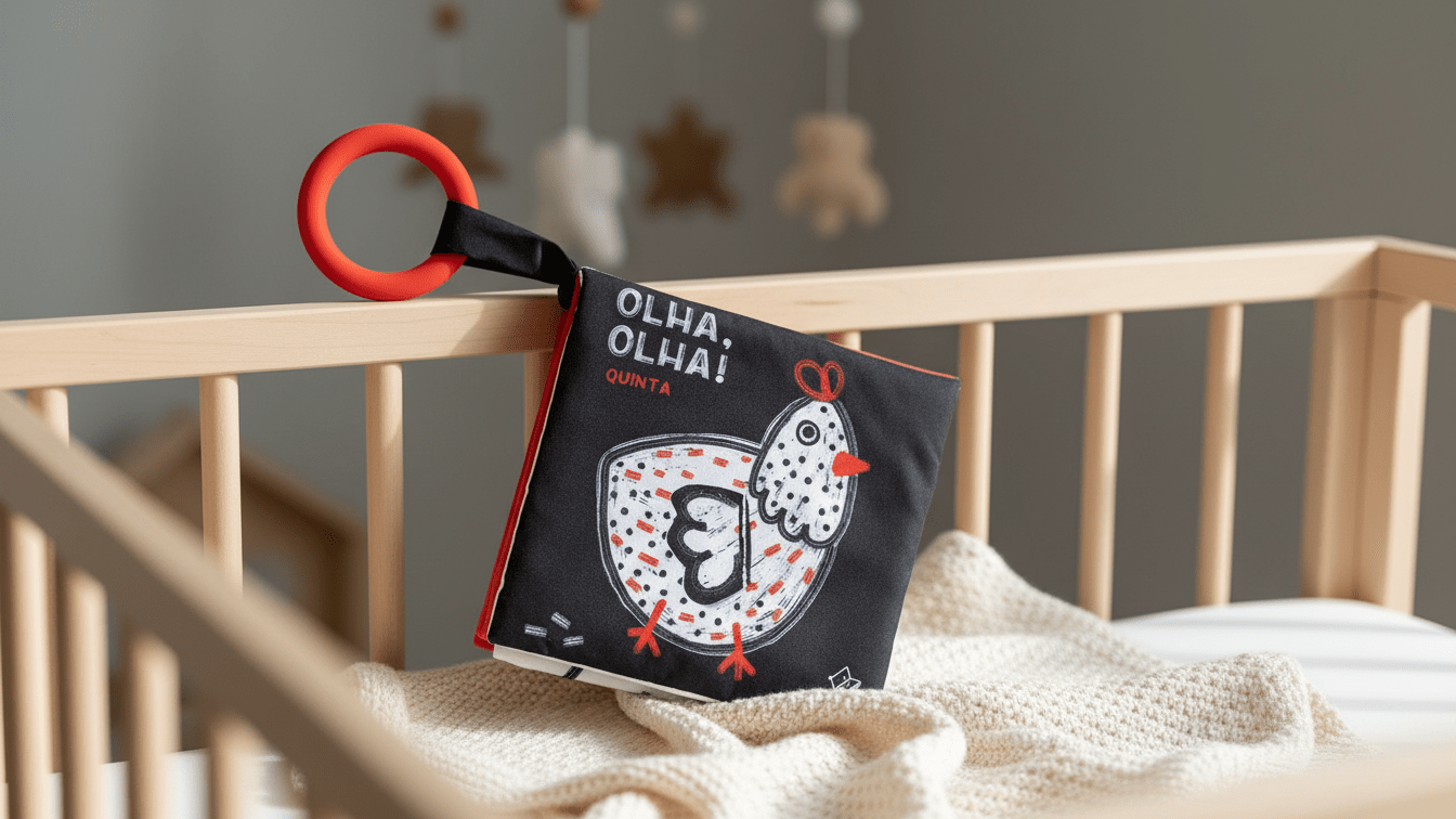 Livro de Tecido de Alto Contraste – Animais da Quinta | 0+ meses 🐄📖✨