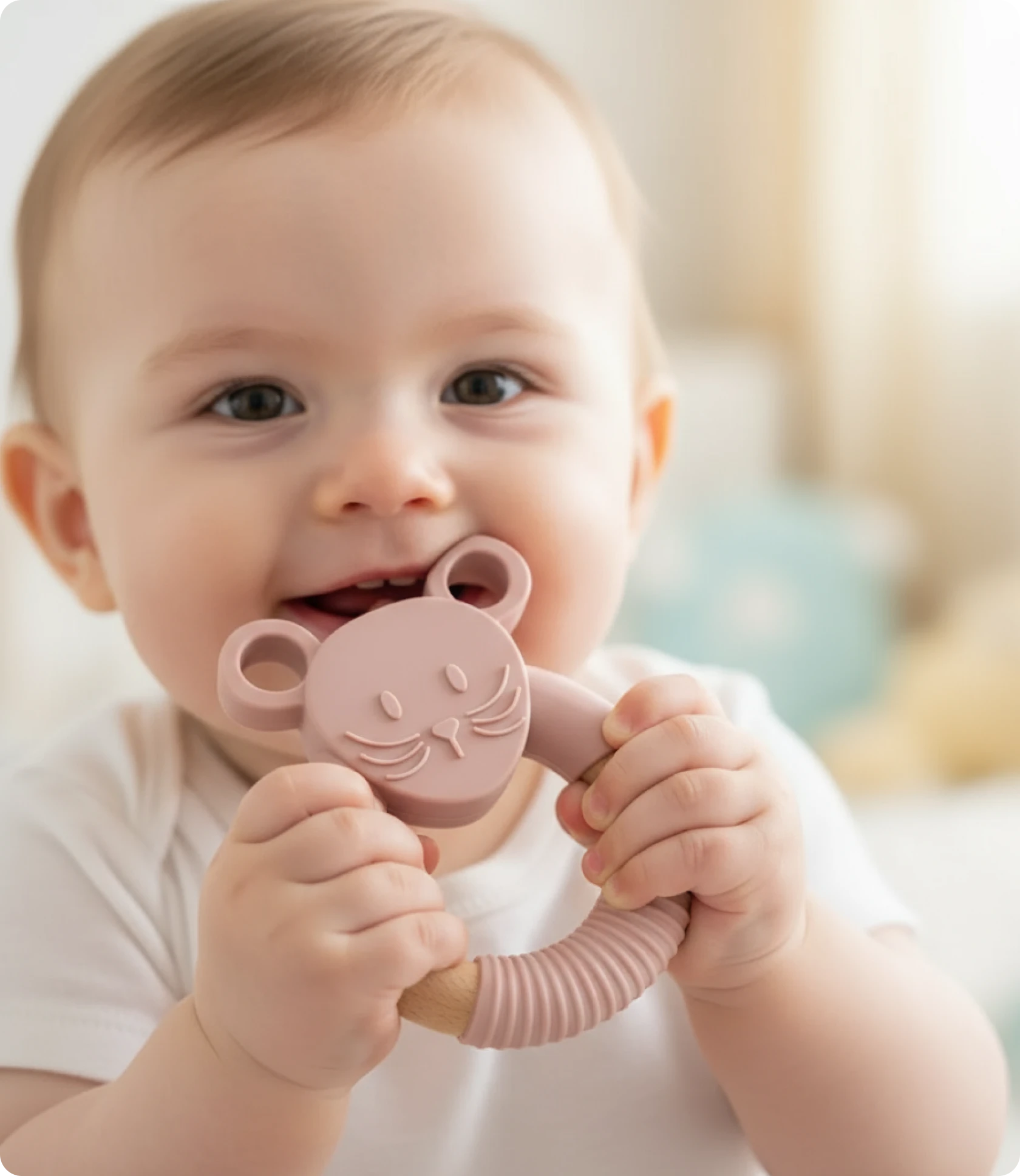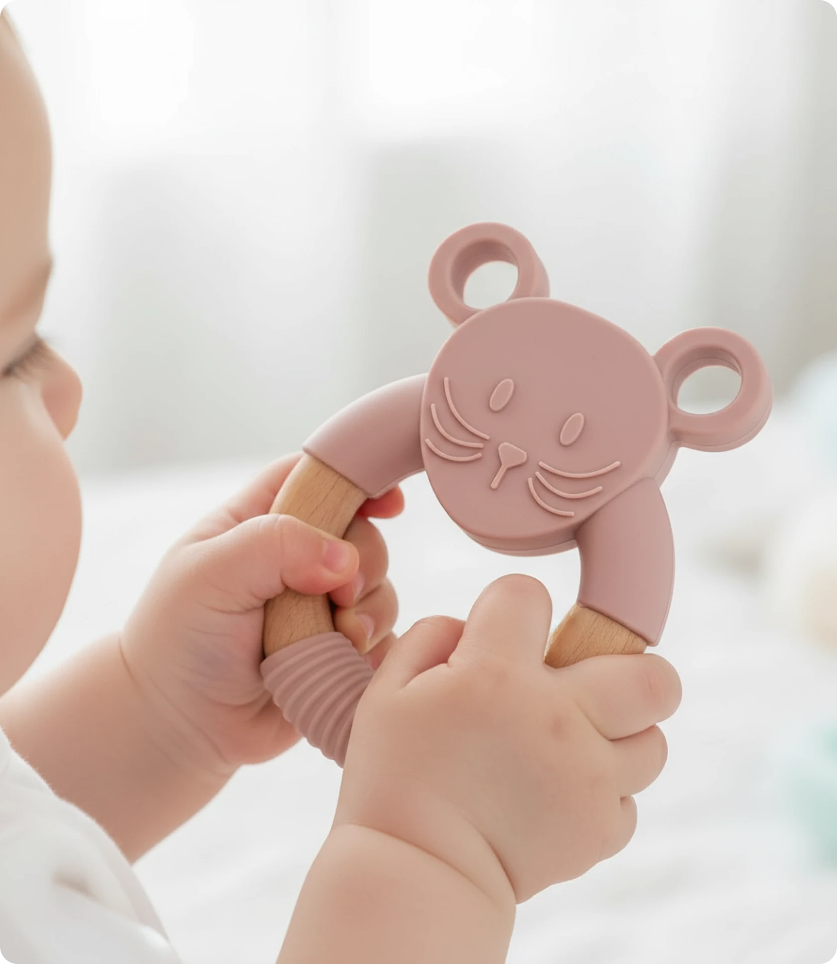 O mordedor em forma de ratinho rosa é o aliado perfeito para aliviar as gengivas do teu bebé durante a dentição.